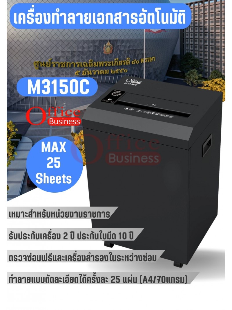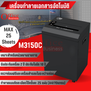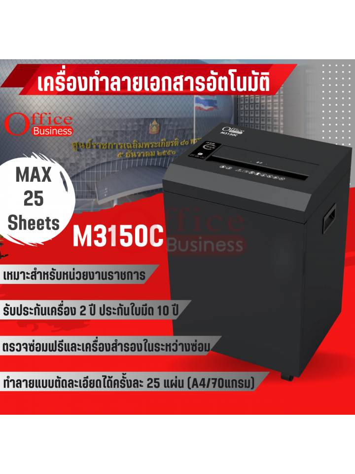เครื่องทำลายเอกสารแบบตัดเส้นตรง ทำลายครั้งละ 40 แผ่น ยี่ห้อ OFFICE BUSINESS ยี่ห้อ M3100S ประกันเครื่อง 2 ปี ใบมีด 10 ปี (ถังจุ 100 ลิตร) มีบริการหลังการขาย