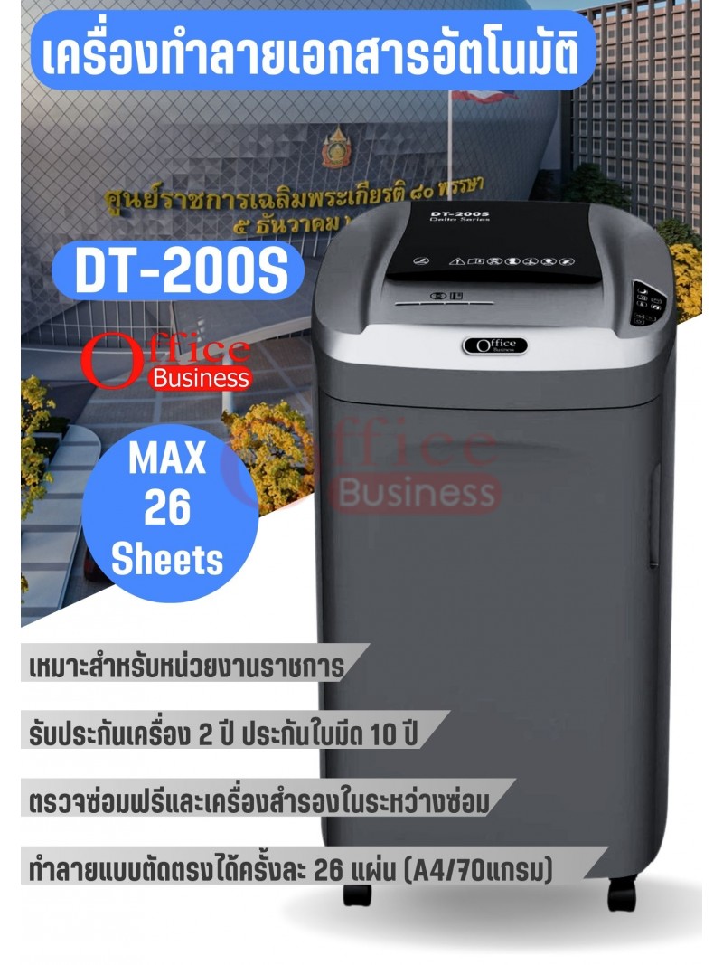 เครื่องทำลายเอกสารแบบตัดเส้นตรง ครั้งละ 26 แผ่น ยี่ห้อ OFFICE BUSINESS รุ่น DT-200S ประกันเครื่อง 2 ปี ใบมีด 10 ปี มีบริการหลังการขาย