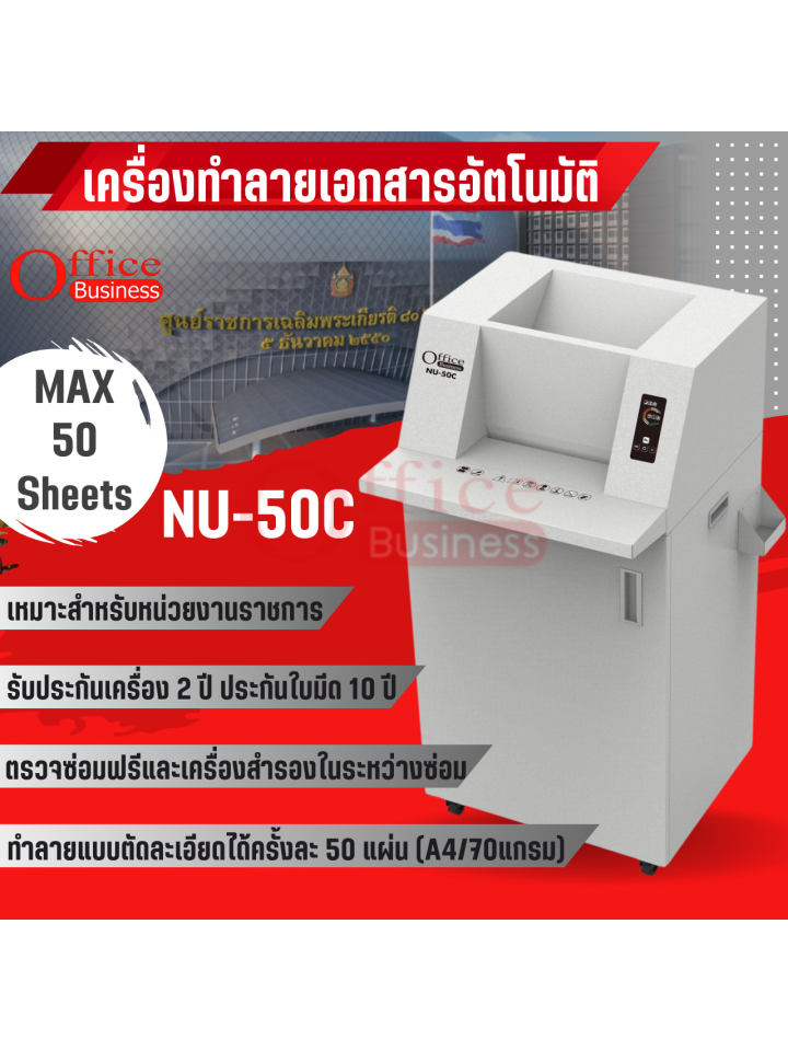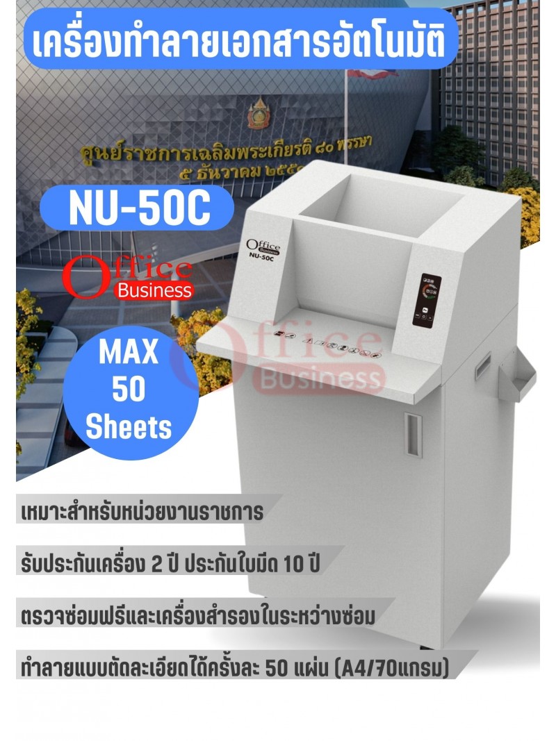 เครื่องทำลายเอกสารแบบตัดละเอียด ทำลายครั้งละ 50 แผ่น OFFICE BUSINESS NU-50C ประกันเครื่อง 2 ปี ใบมีด 10 ปี มีบริการหลังการขาย