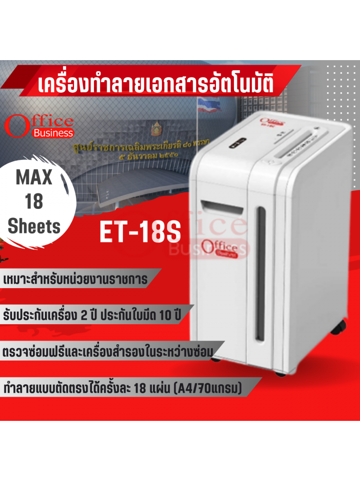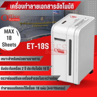 เครื่องทำลายเอกสารแบบตัดละเอียด ครั้งละ 10 แผ่น OFFICE BUSINESS รุ่น ET-18C รับประกัน 2 ปี ใบมีด 10 ปี ใช้สำหรับในหน่วยงานราชการ มีบริการหลังการขาย