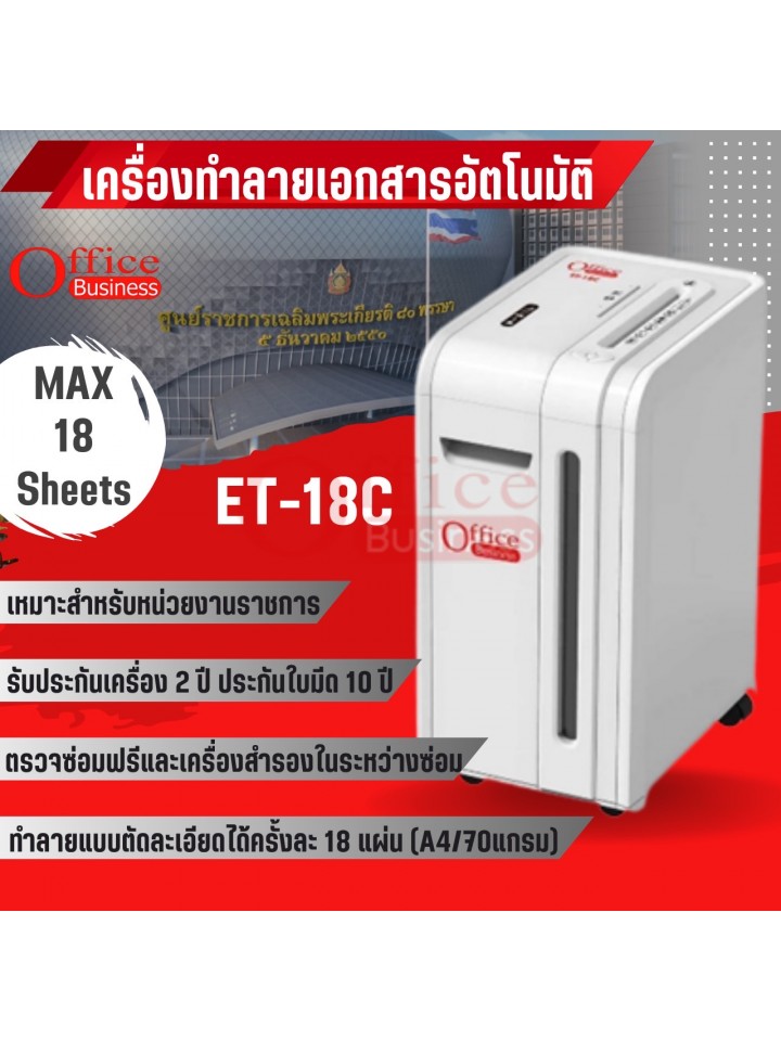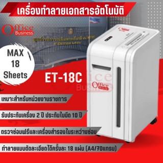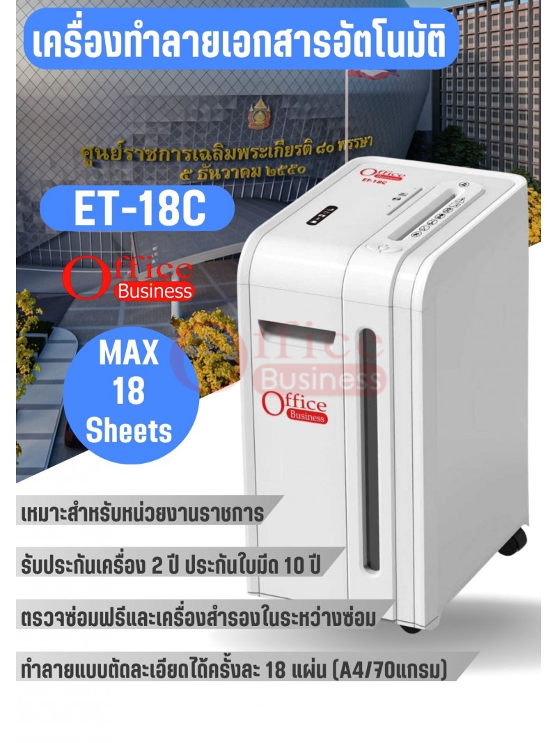 เครื่องทำลายเอกสารแบบตัดเส้นตรง ครั้งละ 10 แผ่น OFFICE BUSINESS รุ่น ET-18S ประกัน 2 ปี ใบมีด 10 ปี สำหรับใช้ในหน่วยงานราชการ มีบริการหลังการขาย