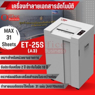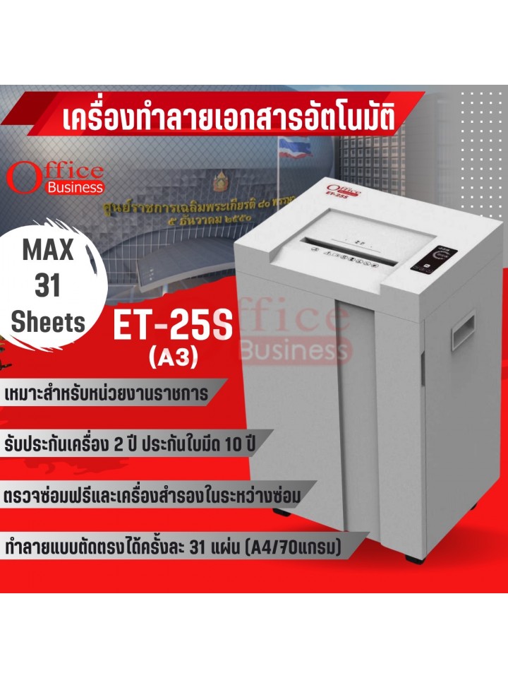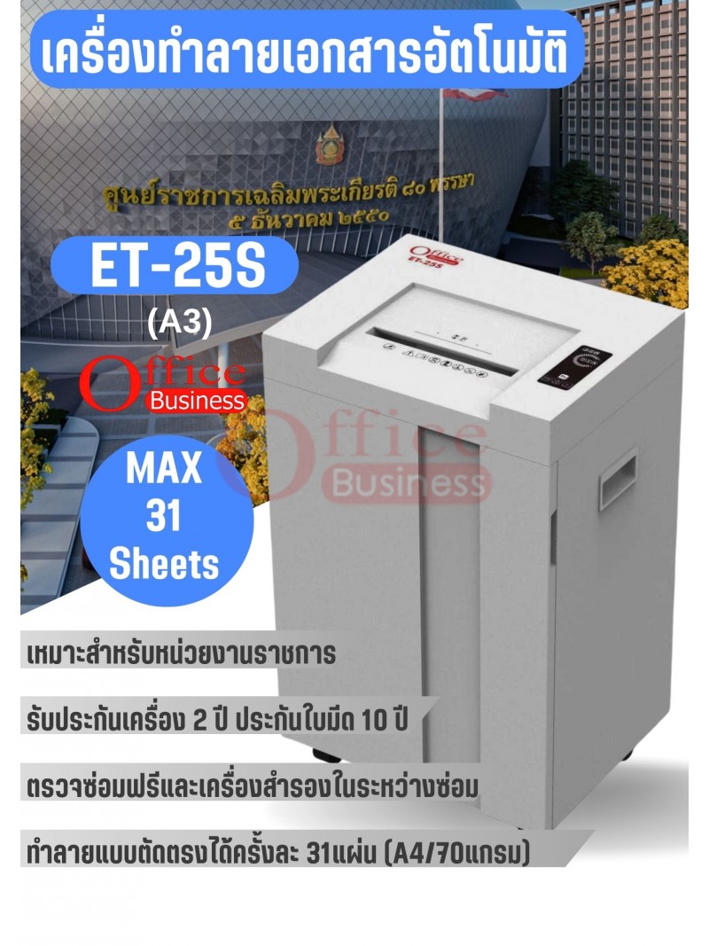 เครื่องทำลายเอกสารแบบตัดเส้นตรง ทำลายครั้งละ 30 แผ่น (A3) ยีห้อ OFFICE BUSINESS รุ่น ET-25S รับประกัน 2 ปี ใบมีด 10 ปี ใช้สำหรับหน่วยงานราชการ มีบริการหลังการขาย